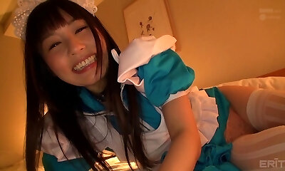 Momoka Rin, a super-naughty and dissolute nubile Asian girl, dresses up in stockings and a maid garb for a hot Asian hump session.